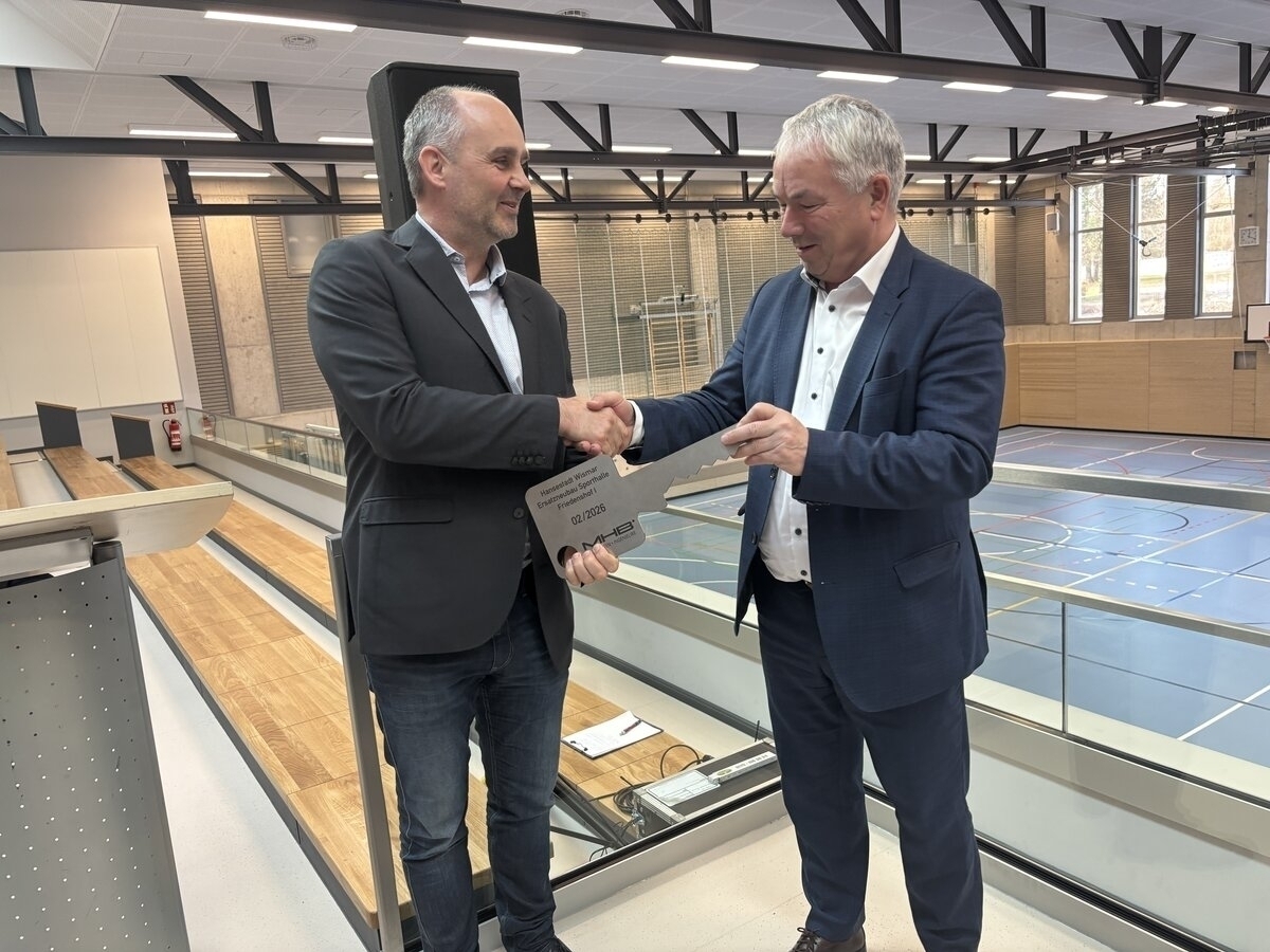 Vor der Besichtigung des neuen Bauwerks überreichte Marko Meißner vom Büro MHB Architekten + Ingenieure einen symbolischen Schlüssel für die Halle an Thomas Beyer. Den großen Schlüssel gab der Bürgermeister anschließend an Andreas Raap, Leiter des Amtes für Hochbau, Service und Liegenschaften, und Ivonne Mucha von der Abteilung Hochbau der Stadtverwaltung weiter.
