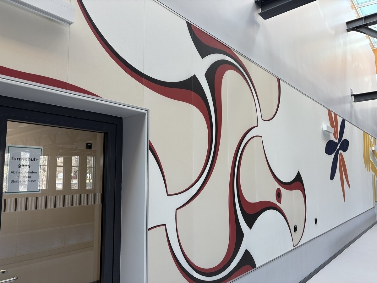 Auf der Rückwand der Tribüne ist das Kunstwerk "Ballwechsel" von Anne Hille zu sehen. Sie hatte sich gegen 19 Mitbewerberinnen und -bewerber durchgesetzt und den zweistufigen Wettbewerb "Kunst am Bau" gewonnen. Es unterstützte Susanne Gabler vom Kunstbeirat der Hansestadt Wismar.
