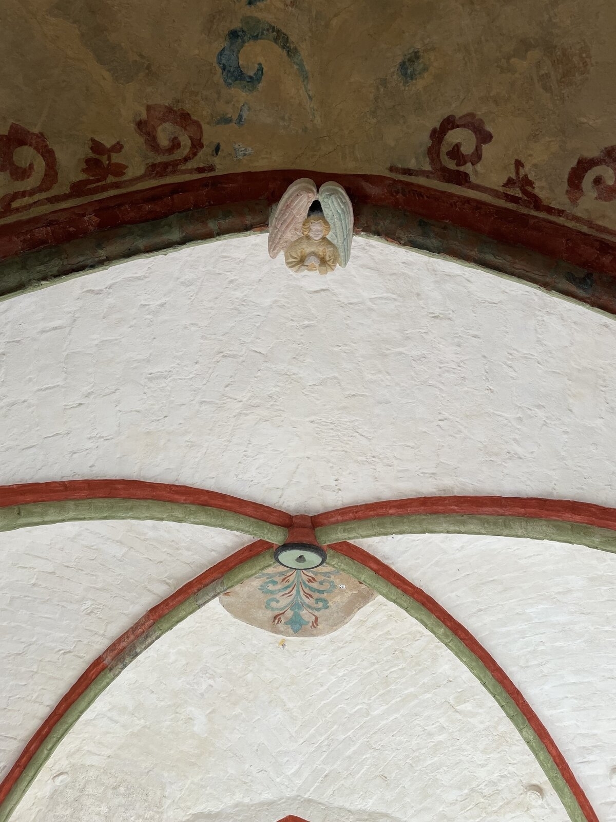 Einzigartig ist, dass eines der beiden Gewölbe über der Sakristei jetzt wieder Ausschnitte der freigelegten mittelalterlichen Fassung neben der instandgesetzten letzten Fassung zeigt. Die Engelsfigur am Rippenbogen zwischen den beiden Gewölben war bis zur Unkenntlichkeit verschmutzt. Restauratorisch wurden behutsam mehrere übereinanderliegende Farbschichten abgenommen und die sehr dekorative, mehrfarbige Originalfassung freigelegt.